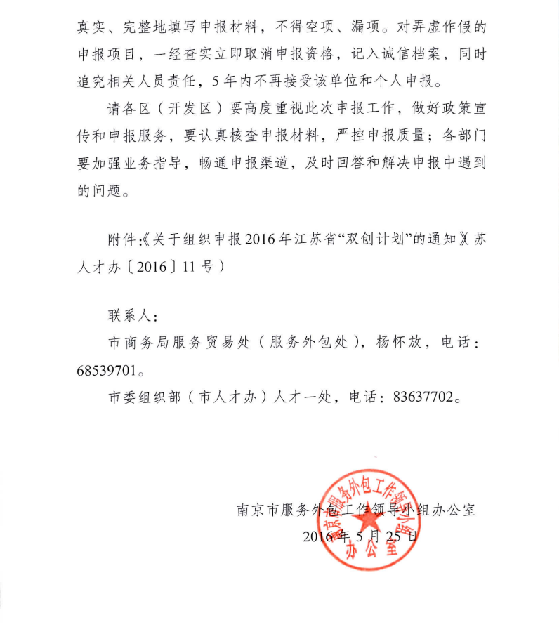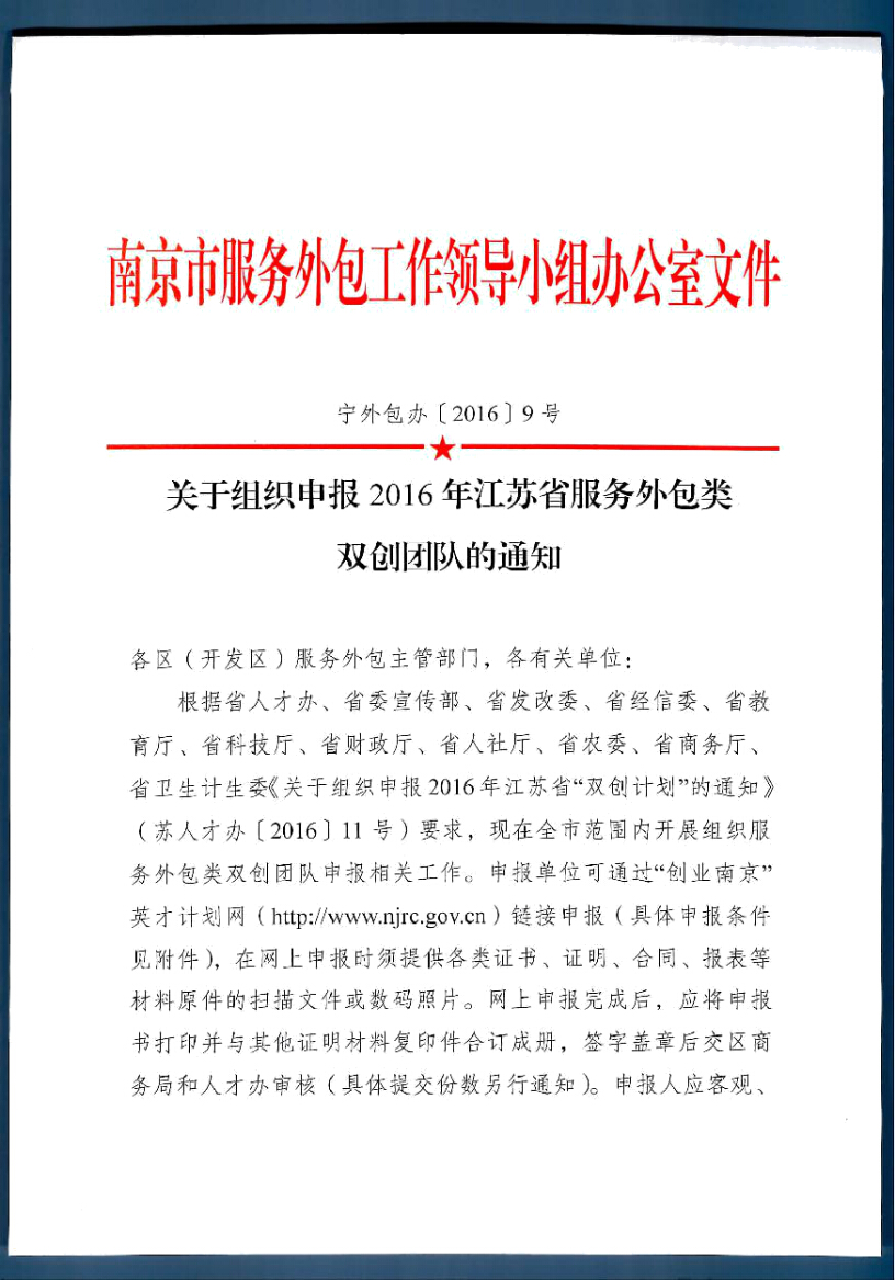 關(guān)于組織申報2016年江蘇省服務(wù)外包類雙創(chuàng)團隊的通知
