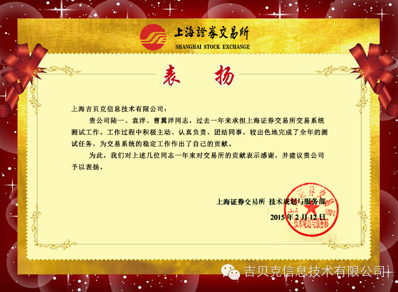近日,吉貝克喜獲上海證券交易所的表?yè)P(yáng)信。上證所高度肯定了吉貝克團(tuán)隊(duì)的工作成績(jī)。吉貝克在2014年承擔(dān)上證所的交易系統(tǒng)測(cè)試工作,以嫻熟的技術(shù)、優(yōu)質(zhì)的服務(wù)為前提,以為客戶創(chuàng)造最高價(jià)值為己任,嚴(yán)把產(chǎn)品質(zhì)量,為交易系統(tǒng)的穩(wěn)定運(yùn)行做出了突出的貢獻(xiàn)。信中特別點(diǎn)名表?yè)P(yáng)了我司陸一、袁洋、曹翼翔同志,稱(chēng)贊這三位同事積極主動(dòng)、認(rèn)真負(fù)責(zé)、團(tuán)結(jié)同事。