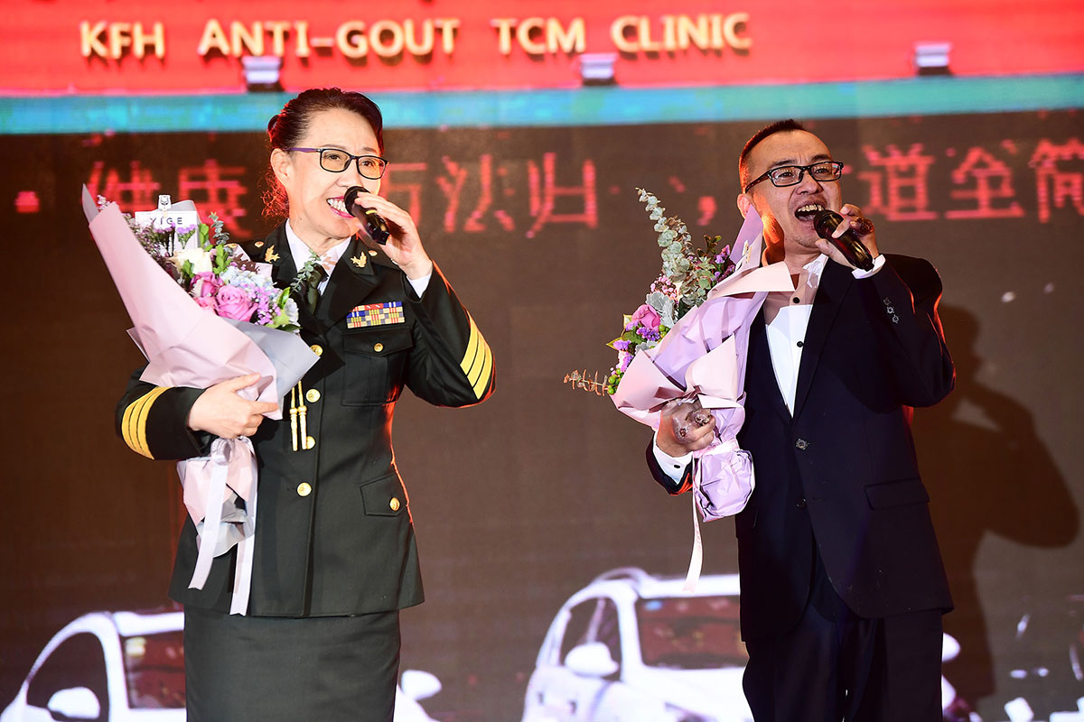 慶典現(xiàn)場最感人的一幕要數(shù)兩位“抗風斗士”葛晟杰和關海強登臺分享一路與痛風抗爭的心路歷程。他們都是風華正茂,卻備受痛風折磨,在遇到抗風竤之前,幾乎都瀕臨絕望。來自山東的25歲葛晟杰,痛風七年、癱瘓三年,經(jīng)過在抗風竤門診的系統(tǒng)治療后,丟掉輪椅和雙拐,自己走上了舞臺;關海強更是在被多家三甲醫(yī)院診斷“不截肢就有生命危險”,并且還面臨著多臟器衰竭的風險,抗風竤醫(yī)療集團張汭鈞董事長冒著極大的風險,向他伸出救助之手。如今的關海強不僅恢復了生命活力,而且還走上舞臺為大家吉他彈唱,重獲新生的他最想感激的就是張汭鈞董事長、程莉琂總裁以及全體抗風竤人給了他重獲健康的希望!